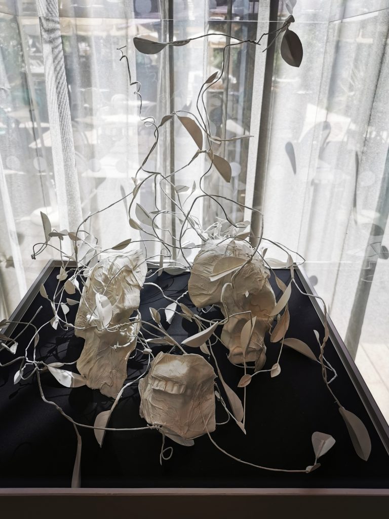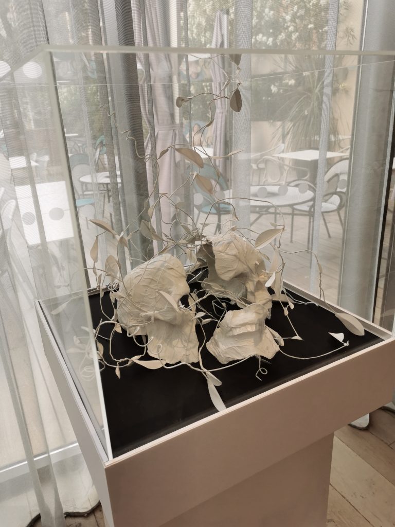 Le voile se plisse pour s’extraire de sa souche et devenir puissance de vie. Les brindilles émergent en silence, les feuilles s’épanouissent, les tiges s’entrelacent et se fondent pour faire exploser leur force et leur énergie. Elles s’arrachent de leur socle en décomposition pour faire émerger ce qui sera le renouveau. Les restes d’humain deviendront poussière. Cette régénération est le témoin magnifique de la vie. Elan vital primordial et évidence d’un monde qui mute et s’inscrit dans l’ordre naturel du vivant… puiser pour se transformer, se nourrir pour devenir autre, dans un ordre cosmique qui touche à l’essentiel et au surnaturel.